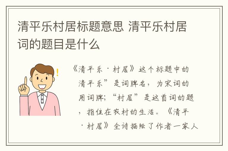 《清平乐·村居》这个标题中的“清平乐”是词牌名,为宋词的常用词牌;“村居”是这首词的题目,指住在农村的生活。《清平乐·村居》全诗描绘了作者一家人闲居农村的生活景象。