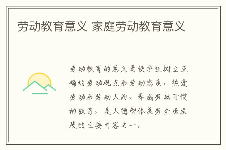 劳动教育的意义是使学生树立正确的劳动观点和劳动态度,热爱劳动和劳动人民,养成劳动习惯的教育,是人德智体美劳全面发展的主要内容之一。