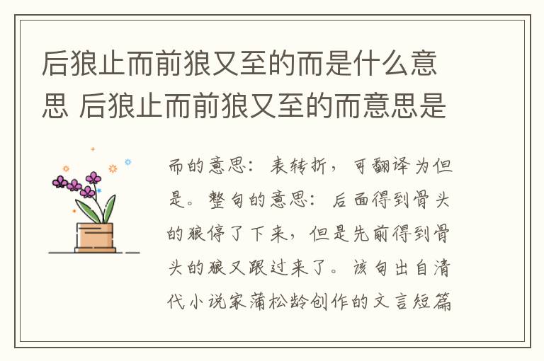 而的意思:表转折,可翻译为但是。整句的意思:后面得到骨头的狼停了下来,但是先前得到骨头的狼又跟过来了。该句出自清代小说家蒲松龄创作的文言短篇小说《狼》,描绘了贪婪、凶狠、狡诈的狼的形象。启示我们对待像狼一样的恶人,不能妥协退让,而要像屠夫一样勇敢斗争、善于斗争,这样才会取得胜利。
