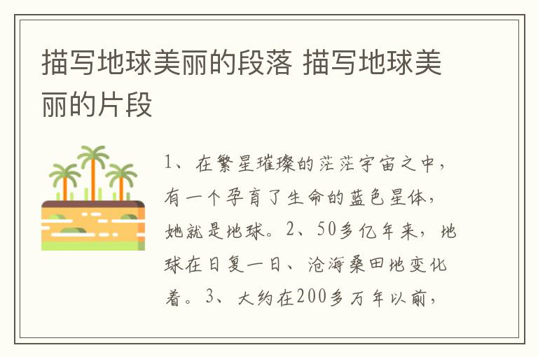 1、在繁星璀璨的茫茫宇宙之中,有一个孕育了生命的蓝色星体,她就是地球。2、50多亿年来,地球在日复一日、沧海桑田地变化着。3、大约在200多万年以前,当人类在地球上诞生时,这个可爱的行星就为人类准备好了美丽、舒适的生存环境、广袤的陆地、浩瀚的海洋、茂密的森林、苍翠的群山、绿色的草原、清新的空气、清澈的江河、迷人的湖泊、旖旎的大自然!