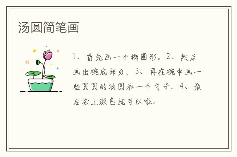 汤圆简笔画 知识分享 3月23日 编辑 童画 取消关注 关注 私信 1、首先画一个椭圆形。 2、然后画出碗底部分。 3、再在碗中画一些圆圆的汤圆和一个勺子。 4、最后涂上颜色就可以啦。 No related posts. 本文内容由互联网用户自发贡献,该文观点仅代表作者本人。本站仅提供信息存储空间服务,不拥有所有权,不承担相关法律责任。如发现本站有涉嫌抄袭侵权/违法违规的内容, 请发送邮件至 2245678901@qq.com 举报,一经查实,本站将立刻删除。 给TA打赏 共{{data.count}}人 人已打赏