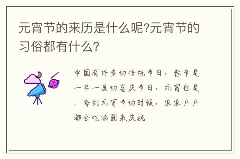 中国有许多的传统节日,春节是一年一度的喜庆节日,元宵也是。每到元宵节的时候,家家户户都会吃汤圆来庆祝,那么元宵节的来历是什么呢?让我们一起来看看吧!