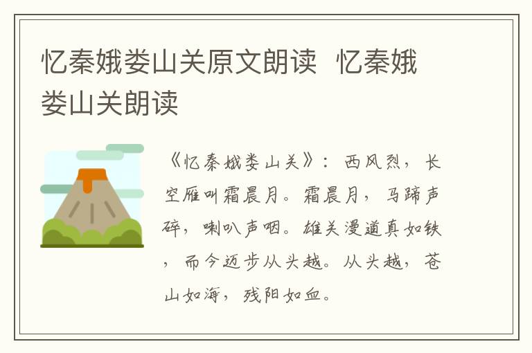 《忆秦娥·娄山关》是现代革命家、文学家毛泽东于1935年创作的一首词。此词上阕写景,下阕抒情,从内到外勾勒出一幅雄浑壮阔的冬夜行军图,描画了红军长征中征战娄山关的紧张激烈场景,表现了作者面对失利和困难从容不迫的气度和博大胸怀。
