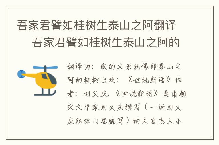 翻译为:我的父亲就像那泰山之阿的桂树出处:《世说新语》作者:刘义庆.《世说新语》是南朝宋文学家刘义庆撰写(一说刘义庆组织门客编写)的文言志人小说集,是魏晋轶事小说的集大成之作,是魏晋南北朝时期“笔记小说”的代表作。其内容主要是记载东汉后期到魏晋间一些名士的言行与轶事。通行本6卷36篇。有梁刘孝标注本。