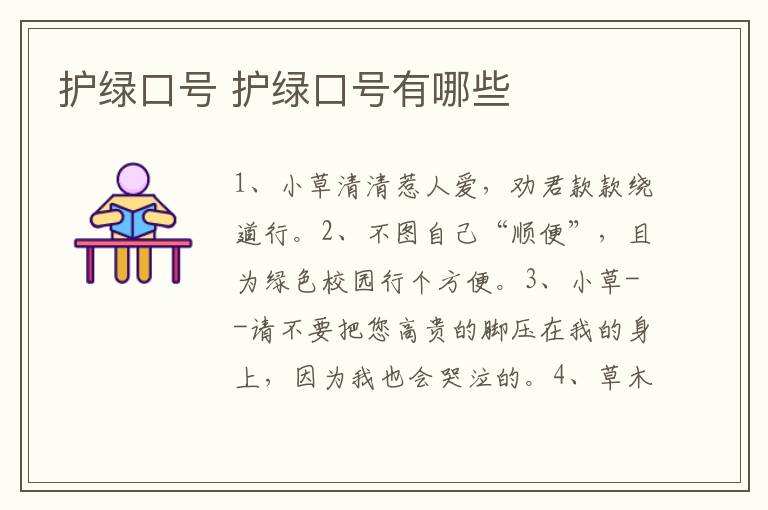 1、小草清清惹人爱,劝君款款绕道行。2、不图自己“顺便”,且为绿色校园行个方便。3、小草--请不要把您高贵的脚压在我的身上,因为我也会哭泣的。4、草木--如果我香消玉陨就无法装扮校园的美丽校园如果你怜香惜玉,请您给我们一些关爱吧。5、谁说草木我无情,校园增添光彩我亦行。6、爱绿护绿,从我做起。7、小草---少了我,花儿就变得黯然。