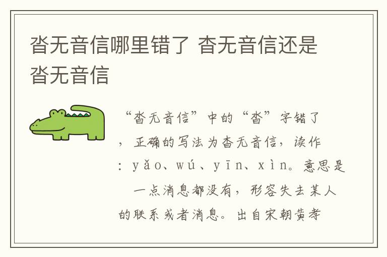“沓无音信”中的“沓”字错了,正确的写法为杳无音信,读作:yǎo、wú、yīn、xìn。意思是:一点消息都没有,形容失去某人的联系或者消息。出自宋朝黄孝迈的《咏水仙》:惊鸿去后,轻抛素袜,杳无音信。杳:本义是昏暗;由幽暗引申为极远;由极远又引申为寻不到踪影。
