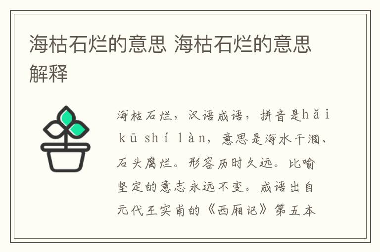 làn,意思是海水干涸、石头腐烂。形容历时久远。比喻坚定的意志永远不变。成语出自元代王实甫的《西厢记》第五本第三折:“这天高地厚情,直到海枯石烂时。”