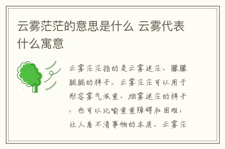 云雾茫茫指的是云雾迷茫、朦朦胧胧的样子。云雾茫茫可以用于形容雾气浓重、烟雾迷茫的样子,也可以比喻重重障碍和困难,让人看不清事物的本质。云雾茫茫的近义词是云雾弥漫。