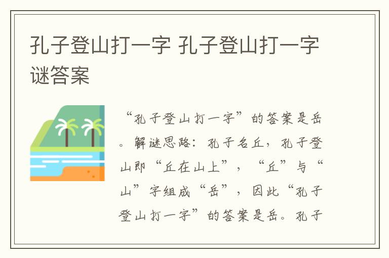 “孔子登山打一字”的答案是岳。解谜思路:孔子名丘,孔子登山即“丘在山上”,“丘”与“山”字组成“岳”,因此“孔子登山打一字”的答案是岳。孔子是中国古代思想家、政治家,又被称为孔夫子。