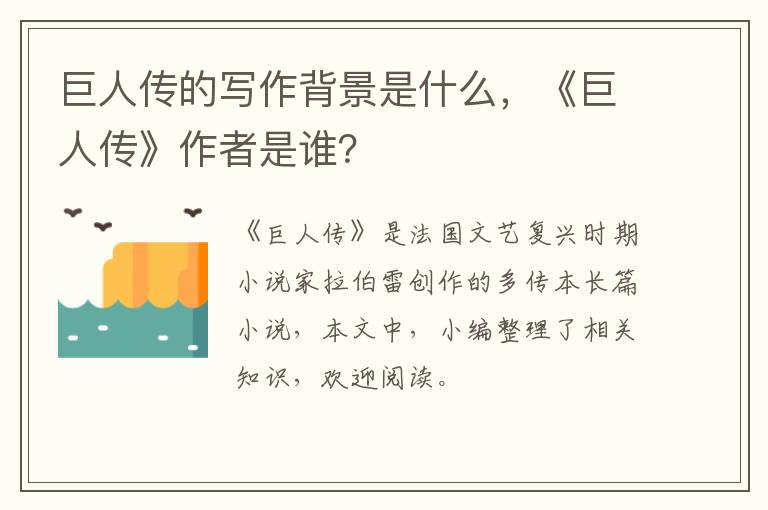 《巨人传》是法国文艺复兴时期小说家拉伯雷创作的多传本长篇小说,本文中,小编整理了相关知识,欢迎阅读。
