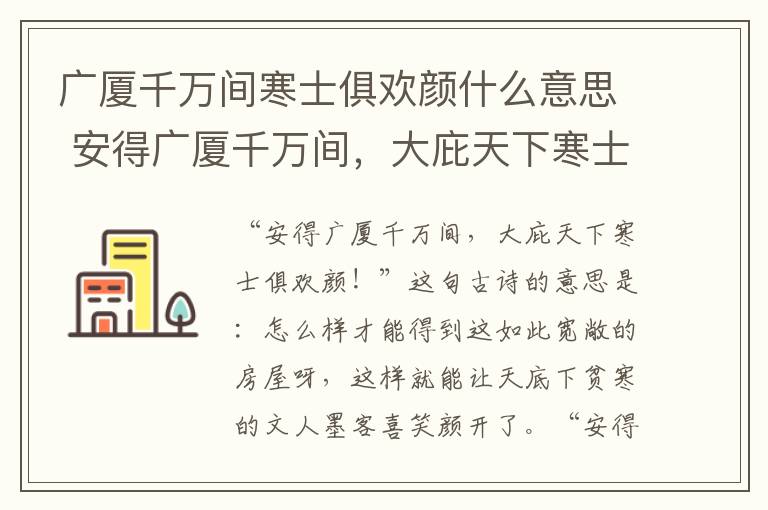 原句是:“安得广厦千万间,大庇天下寒士俱欢颜!”这句古诗的意思是:怎么样才能得到这如此宽敞的房屋呀,这样就能让天底下贫寒的文人墨客喜笑颜开了。“安得广厦千万间,大庇天下寒士俱欢颜!”出自于杜甫的《茅屋为秋风所破歌》。