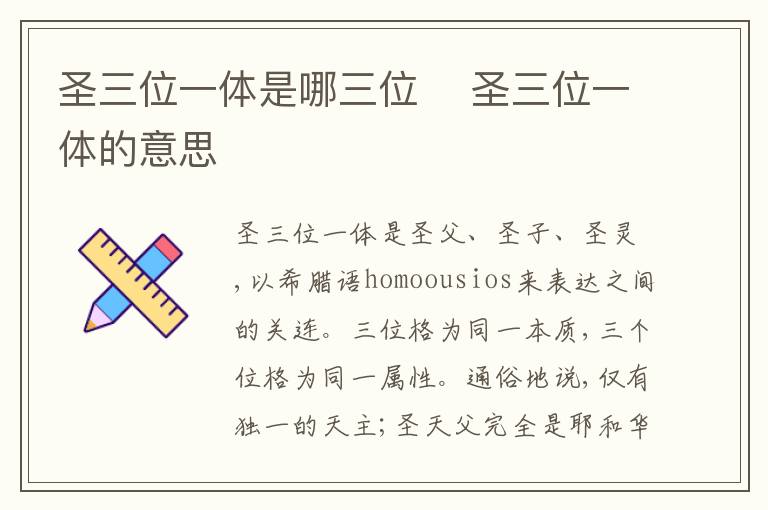 圣三位一体是圣父、圣子、圣灵,以希腊语homoousios来表达之间的关连。三位格为同一本质,三个位格为同一属性。通俗地说,仅有独一的天主;圣天父完全是耶和华上帝,圣子完全是肉身降世的耶稣基督,圣灵是在末后时期降临的再临基督。