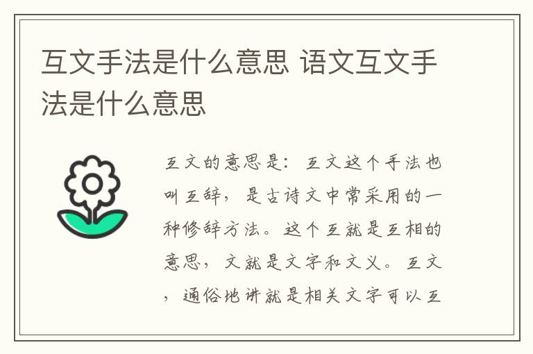互文的意思是:也叫互辞,是古诗文中常采用的一种修辞方法。互就是互相,文就是文字和文义。互文,通俗地讲就是相关文字可以互相省略也可以互相换交换,文义又互相补充,用来表达一个完整的意思的一种修辞。
