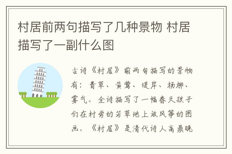 古诗《村居》前两句描写的景物有:青草、黄莺、堤岸、杨柳、雾气。全诗描写了一幅春天孩子们在村旁的芳草地上放风筝的图画。《村居》是清代诗人高鼎晚年归隐于上饶地区、闲居农村时创作的一首七言绝句。全诗内容为:草长莺飞二月天,拂堤杨柳醉春烟。儿童散学归来早,忙趁东风放纸鸢。