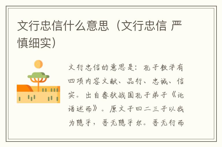 文行忠信的意思是:孔子教学有四项内容文献、品行、忠诚、信实。出自春秋战国孔子弟子《论语述而》。原文子曰二三子以我为隐乎,吾无隐乎尔。吾无行而不与二三子者,是丘也。子以四教文,行,忠,信。本章提出了孔子的教育思想和学习态度,孔子对仁德等重要道德范畴的进一步阐释。