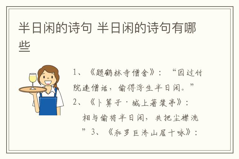 关于半日闲的诗句如下:1、《题鹤林寺僧舍》:“因过竹院逢僧话,偷得浮生半日闲。”2、《卜算子·城上著裴亭》:“相与偷将半日闲,共把尘襟洗。”3、《和罗巨济山居十咏》:“恰有乘风客,来分半日闲。”4、《朝天子》:“劝君更尽一杯酒,赢得浮生半日闲。”5、《松斋偶兴》:“赖此松檐下,朝回半日闲。”