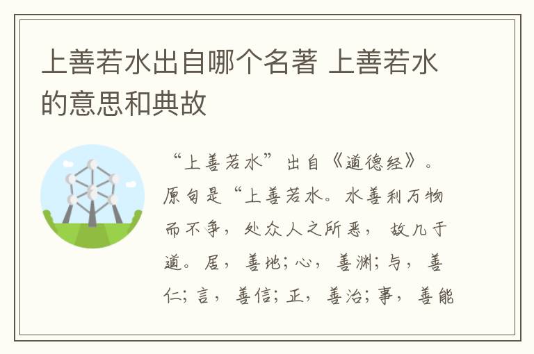 “上善若水”出自《道德经》。原句是“上善若水。水善利万物而不争,处众人之所恶,