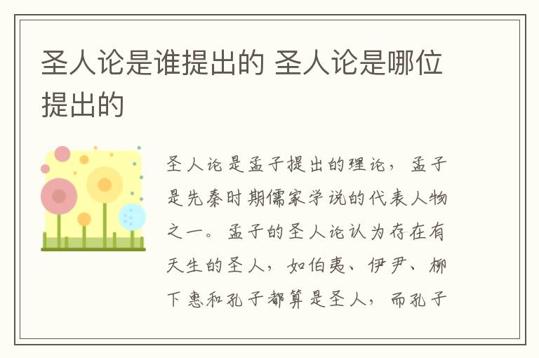 圣人论是孟子提出的理论。孟子是先秦时期儒家学说的代表人物之一,孟子的圣人论认为存在有天生的圣人,如伯夷、伊尹、柳下惠和孔子都算是圣人,而孔子是圣人的集大成者。