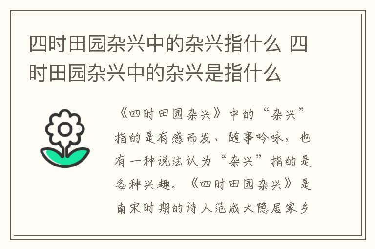 《四时田园杂兴》中的“杂兴”指的是有感而发、随事吟咏,也有一种说法认为“杂兴”指的是各种兴趣。《四时田园杂兴》是南宋时期的诗人范成大隐居家乡后写的一系列田园诗,描写了乡间田园不同季节的不同景象,展现了一幅四季里农村生活的长幅画卷。
