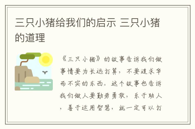《三只小猪》的故事告诉我们做事情要为长远打算,不要追求华而不实的东西。这个故事也告诉我们做人要勤劳勇敢,乐于助人,善于运用智慧,就一定可以打败坏蛋。