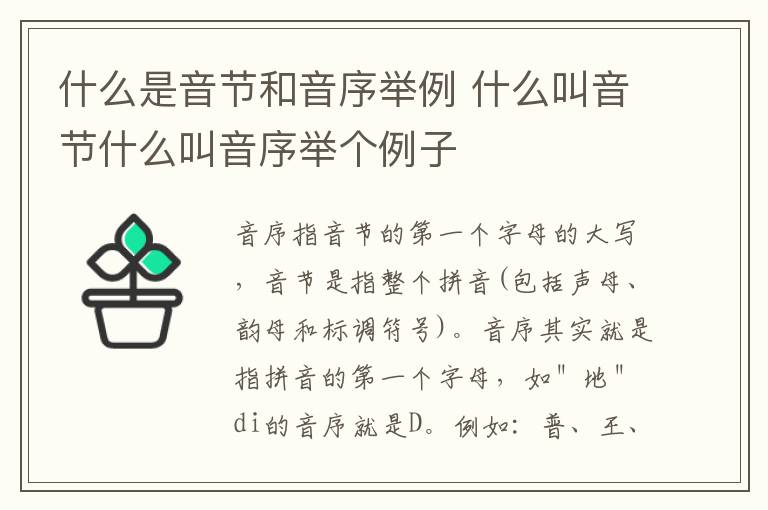 音序指音节的第一个字母的大写,音节是指整个拼音(包括声母、韵母和标调符号)。音序其实就是指拼音的第一个字母,如"地"di的音序就是D。例如:普、王、杰三字的音序和音节分别是:普:音序是P,音节是Pu,王:音序是W,音节是Wang,杰:音序是J音节是Jie。