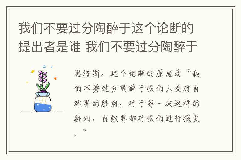 我们不要过分陶醉于这个论断的提出者是谁 我们不要过分陶醉于这个论断是谁提出来的 知识分享 4月7日 编辑 童画 取消关注 关注 私信 这个论断的提出者是恩格斯。这个论断的原话是“我们不要过分陶醉于我们人类对自然界的胜利。对于每一次这样的胜利,自然界都对我们进行报复。” 这个论断是在劝告人们不要一味地破坏和开采自然界,不要一味地向自然界索取,不然最终只会是自食恶果。 No related posts. 本文内容由互联网用户自发贡献,该文观点仅代表作者本人。本站仅提供信息存储空间服务,不拥有所有权,不承担相关法律责任。如发现本站有涉嫌抄袭侵权/违法违规的内容, 请发送邮件至 2245678901@qq.com 举报,一经查实,本站将立刻删除。 给TA打赏 共{{data.count}}人 人已打赏
