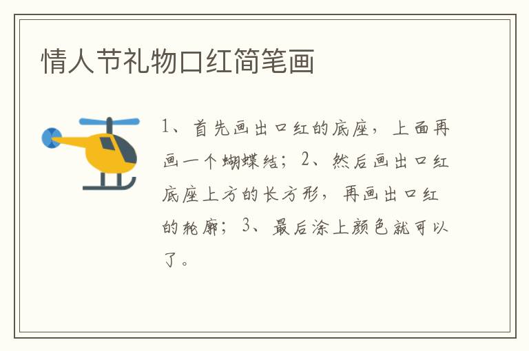 情人节礼物口红简笔画 知识分享 4月17日 编辑 童画 取消关注 关注 私信 1、首先画出口红的底座,上面再画一个蝴蝶结; 2、然后画出口红底座上方的长方形,再画出口红的轮廓; 3、最后涂上颜色就可以了。 No related posts. 本文内容由互联网用户自发贡献,该文观点仅代表作者本人。本站仅提供信息存储空间服务,不拥有所有权,不承担相关法律责任。如发现本站有涉嫌抄袭侵权/违法违规的内容, 请发送邮件至 2245678901@qq.com 举报,一经查实,本站将立刻删除。 给TA打赏 共{{data.count}}人 人已打赏