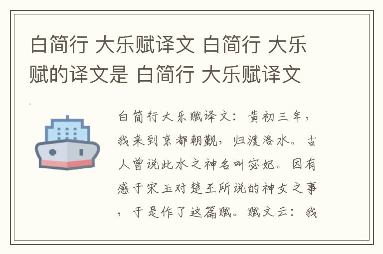 白简行大乐赋译文:黄初三年,我来到京都朝觐,归渡洛水。古人曾说此水之神名叫宓妃。因有感于宋玉对楚王所说的神女之事,于是作了这篇赋。赋文云:我从京都洛阳出发,向东回归封地鄄城,背着伊阙,越过轘辕,途经通谷,登上景山。