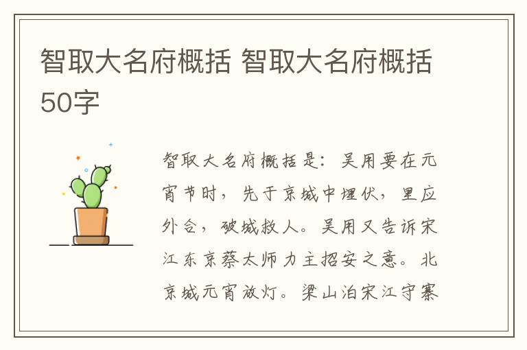智取大名府概括是:吴用要在元宵节时,先于京城中埋伏,里应外合,破城救人。吴用又告诉宋江东京蔡太师力主招安之意。北京城元宵放灯。梁山泊宋江守寨,吴用引八路人马进驻城下。时迁在北京翠云楼放火,城中大乱,梁中书四个城门冲不出去。后从南门夺路而走。城内柴进救出卢俊义、石秀,捉了李固,贾氏。