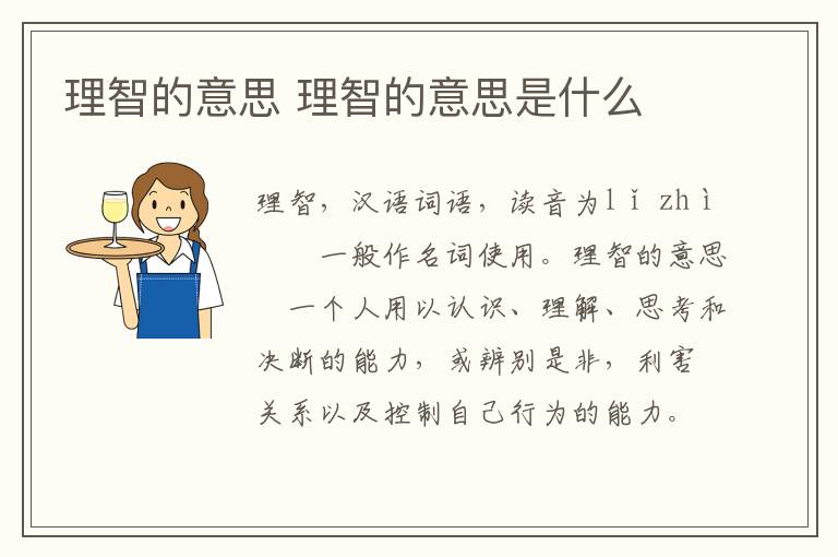 理智,汉语词语,读音为lǐ zhì,一般作名词使用。理智的意思是一个人用以认识、理解、思考和决断的能力,或辨别是非,利害关系以及控制自己行为的能力。词语出自巴金《家》:“你的理智可以征服感情,我的理智则常被感情征服。”