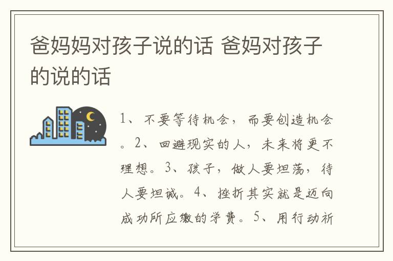 1、不要等待机会,而要创造机会。2、回避现实的人,未来将更不理想。3、孩子,做人要坦荡,待人要坦诚。4、挫折其实就是迈向成功所应缴的学费。5、用行动祈祷比用言语更能够使上帝了解。6、环境不会改变,解决之道在于改变自己。7、妈妈相信,你敢于挑战自己,你能成功。