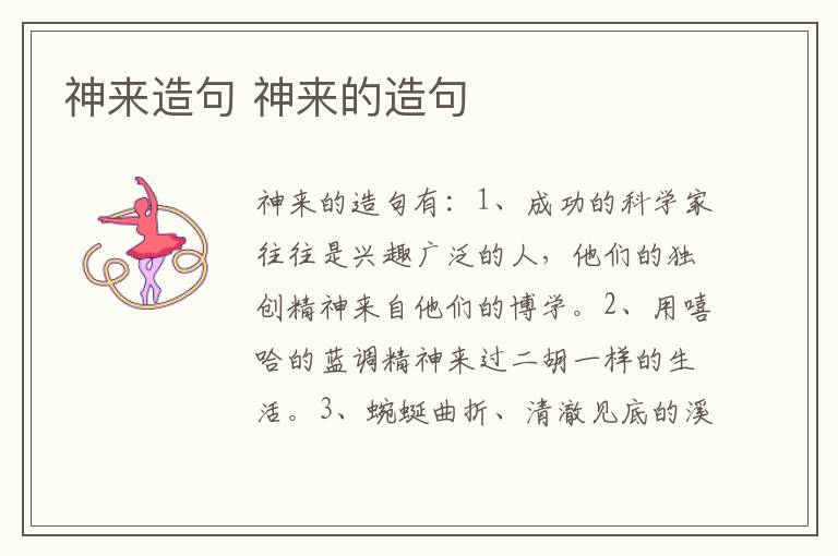 神来的造句有:1、成功的科学家往往是兴趣广泛的人,他们的独创精神来自他们的博学。2、用嘻哈的蓝调精神来过二胡一样的生活。3、蜿蜒曲折、清澈见底的溪水从我脚下淌过,我这才回过神来,从美妙的音乐中探出头来,溪水在向我打招呼,我发现,在明丽的阳光下,她像一条银龙在翻滚,跳跃。