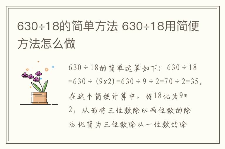 630÷18的简单运算如下:630÷18=630÷(9x2)=630÷9÷2=70÷2=35。在这个简便计算中,将18化为9*2,从而将三位数除以两位数的除法化简为三位数除以一位数的除法。简便计算是运用了运算定律与数字的基本性质,从而使计算简便的方法。