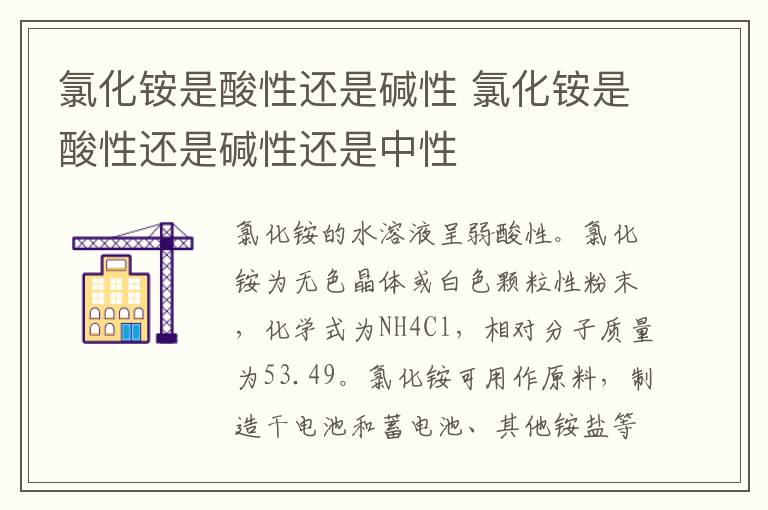 氯化铵的水溶液呈弱酸性。氯化铵为无色晶体或白色颗粒性粉末,化学式为NH4Cl,相对分子质量为53.49。氯化铵可用作原料,制造干电池和蓄电池、其他铵盐等。氯化铵可以用作染色助剂,也用于镀锡和镀锌等。