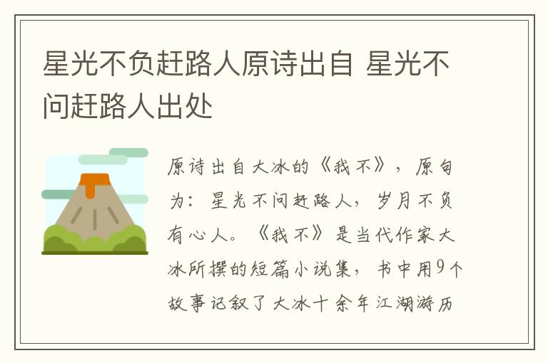 原诗出自大冰的《我不》,原句为:星光不问赶路人,岁月不负有心人。《我不》是当代作家大冰所撰的短篇小说集,书中用9个故事记叙了大冰十余年江湖游历中结识的朋友们的故事,有的是爱的坚持与守护,有的是日常不曾尝试却跃跃欲试的生活。