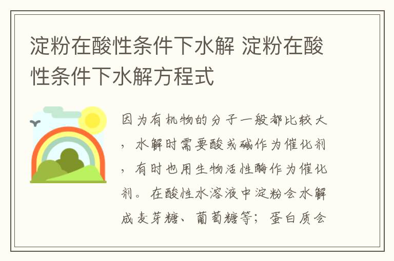 因为有机物的分子一般都比较大,水解时需要酸或碱作为催化剂,有时也用生物活性酶作为催化剂。在酸性水溶液中淀粉会水解成麦芽糖、葡萄糖等;蛋白质会水解成氨基酸等分子量比较小的物质。在热水里淀粉颗粒会膨胀,有一部分淀粉溶解在水里,另一部分悬浮在水里,形成胶状淀粉糊。淀粉进入人体后,一部分淀粉受唾液所含淀粉酶的催化作用,发生水解反应,生成麦芽糖。