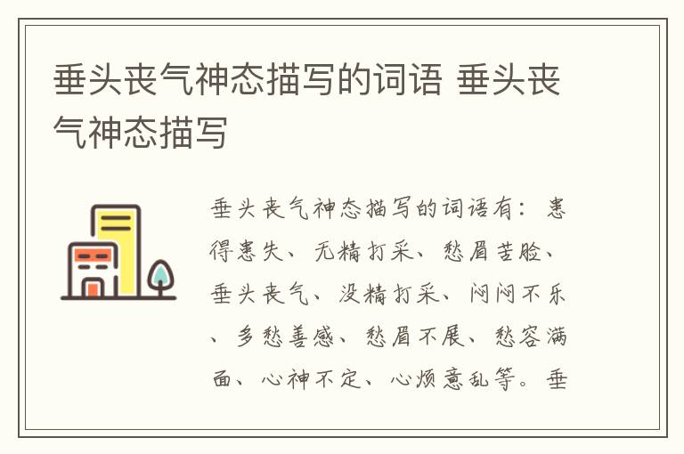 垂头丧气神态描写的词语有:患得患失、无精打采、愁眉苦脸、垂头丧气、没精打采、闷闷不乐、多愁善感、愁眉不展、愁容满面、心神不定、心烦意乱等。垂头丧气是一个汉语成语,形容因失败或不顺利而情绪低落、萎靡不振的样子。出自《新唐书》:自见势去,计无所用,垂头丧气。译文:看见大势已经过去了,没有计可以用,垂头丧气的。