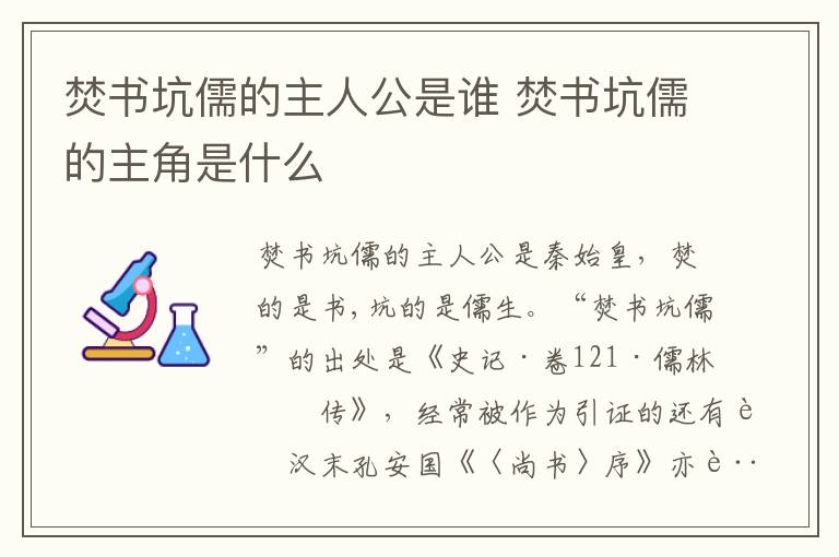 焚书坑儒的主人公是秦始皇,焚的是书,坑的是儒生。“焚书坑儒”的出处是《史记·卷121·儒林列传》,经常被作为引证的还有西汉末孔安国《〈尚书〉序》亦言:“及秦始皇灭先代典籍,焚书坑儒,天下学士逃难解散”。
