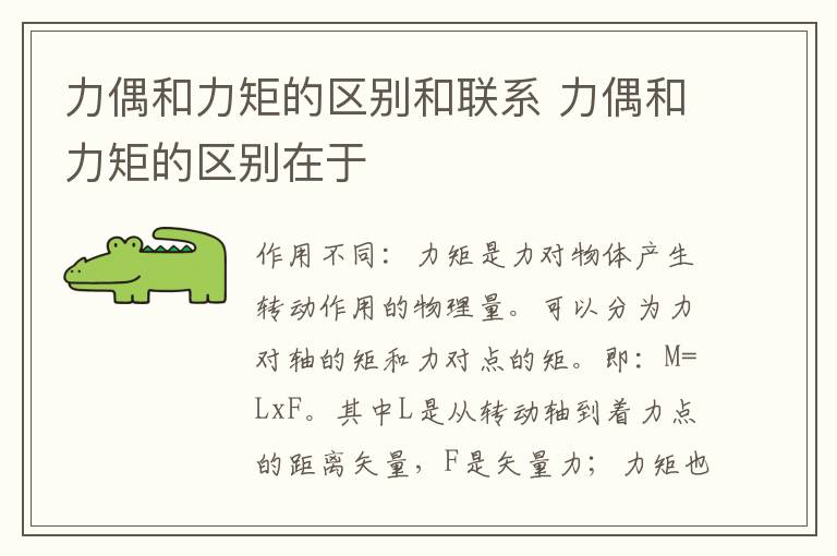 作用不同:力矩是力对物体产生转动作用的物理量。可以分为力对轴的矩和力对点的矩。即:M=LxF。其中L是从转动轴到着力点的距离矢量,F是矢量力;力矩也是矢量。力偶是作用于同一刚体上的一对大小相等、方向相反、但不共线的一对平行力。