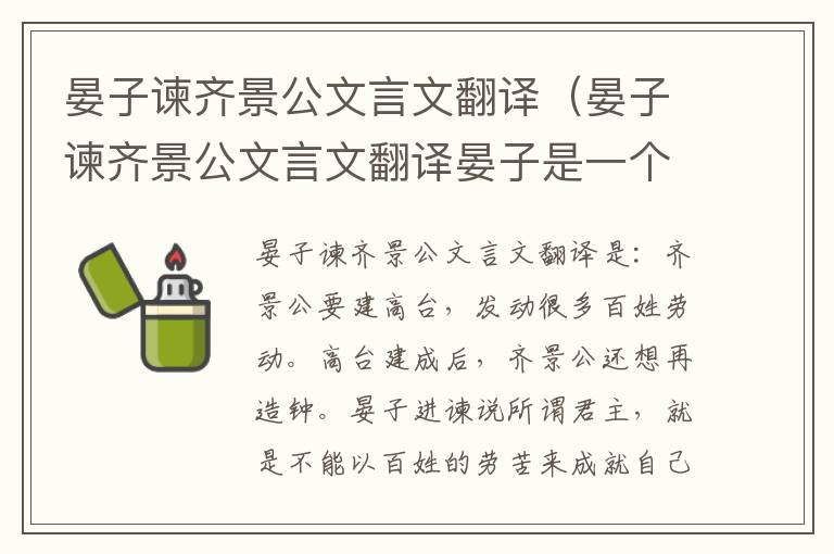 晏子谏齐景公文言文翻译是:齐景公要建高台,发动很多百姓劳动。高台建成后,齐景公还想再造钟。晏子进谏说:“所谓君主,就是不能以百姓的劳苦来成就自己的乐趣。君主无法控制自己的欲望,已经建筑了高台,现在又要造钟,是对百姓很大的负担,百姓必定会不高兴。