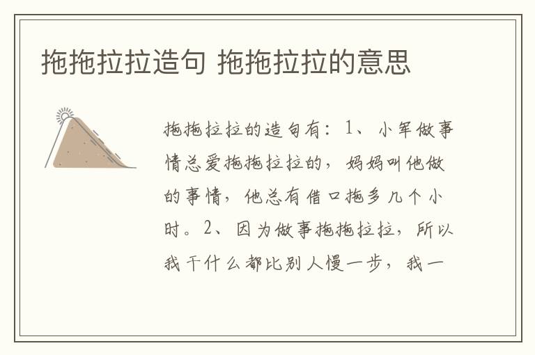 拖拖拉拉的造句有:1、小军做事情总爱拖拖拉拉的,妈妈叫他做的事情,他总有借口拖多几个小时。2、因为做事拖拖拉拉,所以我干什么都比别人慢一步,我一定要努力克服这个坏毛病。3、我要改掉做事拖拖拉拉的毛病。