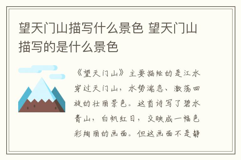 《望天门山》主要描绘的是江水穿过天门山,水势湍急、激荡回旋的壮丽景色。这首诗写了碧水青山,白帆红日,交映成一幅色彩绚丽的画面。但这画面不是静止的,而是流动的。随着诗人行舟,山断江开,东流水回,青山相对迎出,孤帆日边驶来。景色由远及近再及远地展开,赞美了大自然的神奇壮丽。