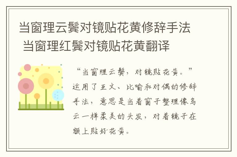 “当窗理云鬓,对镜贴花黄。”运用了互文、比喻和对偶的修辞手法,意思是当着窗子整理像乌云一样柔美的头发,对着镜子在额上贴好花黄。
