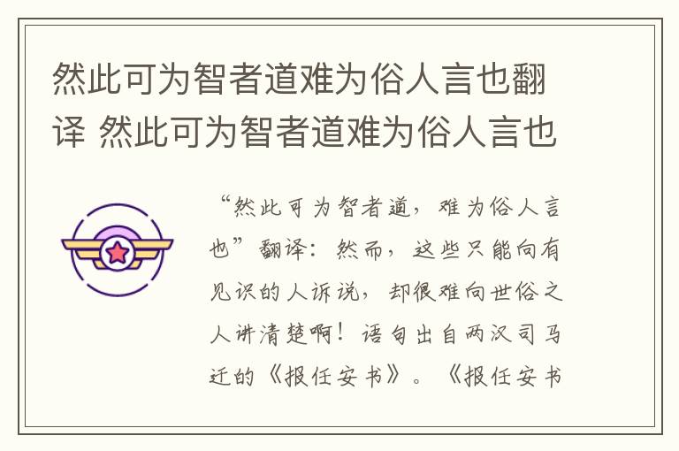 “然此可为智者道,难为俗人言也”翻译:然而,这些只能向有见识的人诉说,却很难向世俗之人讲清楚啊!语句出自两汉司马迁的《报任安书》。《报任安书》是汉代史学家、文学家司马迁写给其友人任安的一封回信。作者在信中以激愤的心情,饱满的感情,陈述了自己的不幸遭遇,抒发了为著作《史记》而不得不含垢忍辱苟且偷生的痛苦心情。