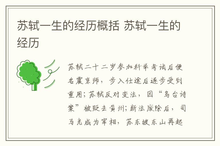 苏轼的一生可以概括为“三起三落”。苏轼二十二岁参加科举考试后便名震京师,步入仕途后逐步受到重用;苏轼反对变法,因“乌台诗案”被贬去黄州;新法废除后,司马光成为宰相,苏东坡东山再起,升为正三品官员;苏轼与司马光政见不合,请辞外放;苏东坡再回朝廷,职位频繁调动;到宋哲宗亲政时,苏东坡被一贬再贬,最后贬到儋州。