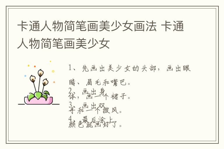 卡通人物简笔画美少女画法 卡通人物简笔画美少女 知识分享 5月16日 编辑 童画 取消关注 关注 私信 1、先画出美少女的头部,画出眼睛、眉毛和嘴巴。 2、画出身体,画一个裙子。 3、画出双手和一个披风。 4、最后涂上颜色就画好了。 No related posts. 本文内容由互联网用户自发贡献,该文观点仅代表作者本人。本站仅提供信息存储空间服务,不拥有所有权,不承担相关法律责任。如发现本站有涉嫌抄袭侵权/违法违规的内容, 请发送邮件至 2245678901@qq.com 举报,一经查实,本站将立刻删除。 给TA打赏 共{{data.count}}人 人已打赏