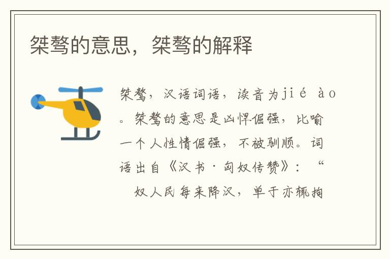 桀骜的意思,桀骜的解释 知识分享 5月16日 编辑 童画 取消关注 关注 私信 桀骜,汉语词语,读音为jié ào。桀骜的意思是凶悍倔强,比喻一个人性情倔强,不被驯顺。词语出自《汉书·匈奴传赞》:“匈奴人民每来降汉,单于亦辄拘留汉使以相报复,其桀骜尚如斯,安肯以爱子而为质乎。” 桀骜的近义词有:不羁 反义词有:温顺 词语造句:这个老人天生桀骜不驯,他的脾气就是要反对每一个人。 No related posts. 本文内容由互联网用户自发贡献,该文观点仅代表作者本人。本站仅提供信息存储空间服务,不拥有所有权,不承担相关法律责任。如发现本站有涉嫌抄袭侵权/违法违规的内容, 请发送邮件至 2245678901@qq.com 举报,一经查实,本站将立刻删除。 给TA打赏 共{{data.count}}人 人已打赏