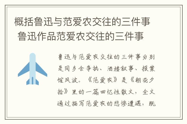 鲁迅与范爱农交往的三件事分别是同乡会争执、酒楼叙事、报案馆风波。《范爱农》是《朝花夕拾》里的一篇回忆性散文,全文通过描写范爱农的悲惨遭遇,既揭露了封建社会对正直爱国的知识分子的摧残,又对辛亥革命的不彻底性,对辛亥革命前后的社会病态,进行了深刻的揭露和批判。