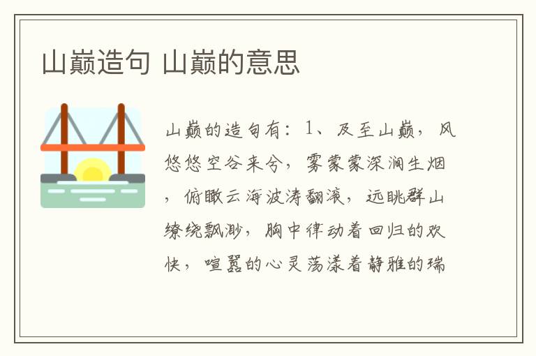 山巅的造句有:1、及至山巅,风悠悠空谷来兮,雾蒙蒙深涧生烟,俯瞰云海波涛翻滚,远眺群山缭绕飘渺,胸中律动着回归的欢快,喧嚣的心灵荡漾着静雅的瑞端,可谓:人在天庭走,胸生万里云。2、太阳刚从苍苍的山巅后面露出来,它那最初几道光芒的温暖跟即将消逝的黑夜的清凉交流在一起,使人感到一种甜美的倦意。3、这时候,夕阳已经衔着山巅了,西面的半边天空,像起了大火球似的,燃烧着一片血红的晚霞。
