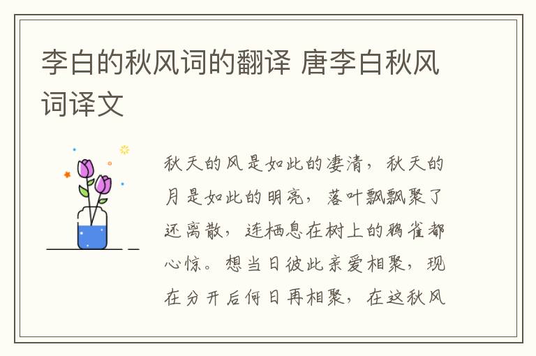 秋天的风是如此的凄清,秋天的月是如此的明亮,落叶飘飘聚了还离散,连栖息在树上的鸦雀都心惊。想当日彼此亲爱相聚,现在分开后何日再相聚,在这秋风秋月的夜里,想起来想真是情何以堪;走入相思之门,知道相思之苦,永远的相思永远的的回忆,短暂的相思却也无止境,早知相思如此的在心中牵绊,不如当初就不要相识。